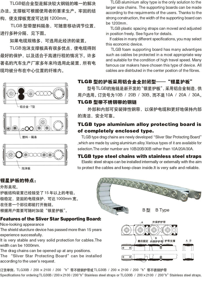 TL型機(jī)床鋼鋁拖鏈的主體是由鏈板(優(yōu)質(zhì)鋼板鍍鉻)支撐板(擠拉鋁合金)軸銷(合金鋼)等部件組成,使電纜或橡膠管與拖鏈之間不產(chǎn)生相對運動,不產(chǎn)生扭曲變形,鏈板經(jīng)鍍鉻處理外形效果新穎,結(jié)構(gòu)合理,靈巧強度高,鋼性好不變形,安裝方便,使用可靠,易拆裝,尤其是本產(chǎn)品采用了高強度耐磨材料,合金銅為軸銷,提高了產(chǎn)品的耐磨強度,彎曲更靈活,阻力更小,降低了噪音,從而可保 長時間使用不變形,不下垂。